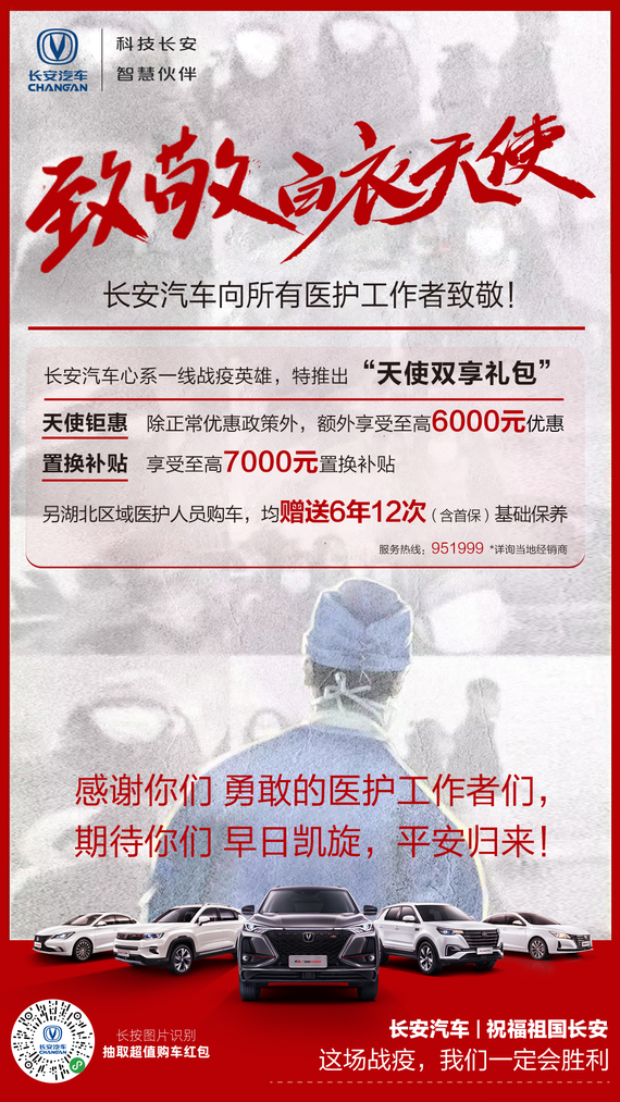 疫情爆发以来,广大医务人员奋战在疫情抗击最前线,在这场没有硝烟的战“疫”中不辞辛劳、不舍昼夜。长安汽车心系抗疫英雄,在全国范围内开展“医护人员优惠购车”活动,除常规优惠政策外,医护人员购车还能额外享受6000元优惠,以及至高7000元的置换补贴。此外针对湖北区域的医务人员,凡购买长安乘用车全系车型,长安汽车更赠送6年12次基础保养,保障抗疫前线医务工作人员用车无忧。
